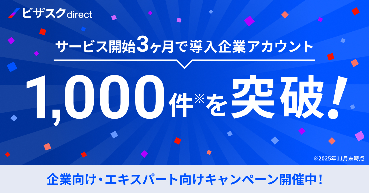 「知見と、挑戦をつなぐ」をミッションにグローバルなナレッジプラットフォームを運営する株式会社ビザスク(以下、当社)は、2025年9月に提供を開始した、多様な「知見」を起点にした新たな人材マッチングサービス「ビザスクdirect」の導入企業アカウントが1,000件を突破したことをお知らせいたします。