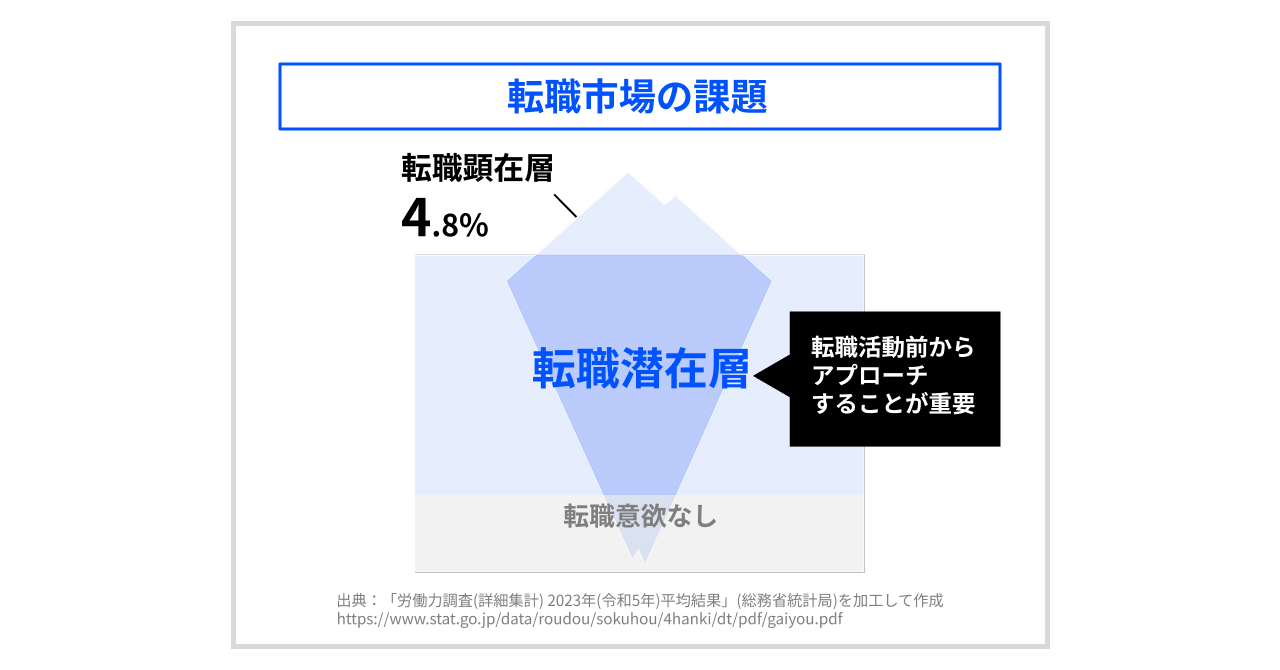 総務省の労働力調査によると、積極的に転職活動をしている「転職顕在層」は、全体の4.8%にとどまることがわかりました。「現在は転職活動をしていないが、条件次第で転職を検討したい」という人材は一定数存在しており、こうした転職潜在層にどのように接点を持つかが、企業の採用活動における重要な課題です。