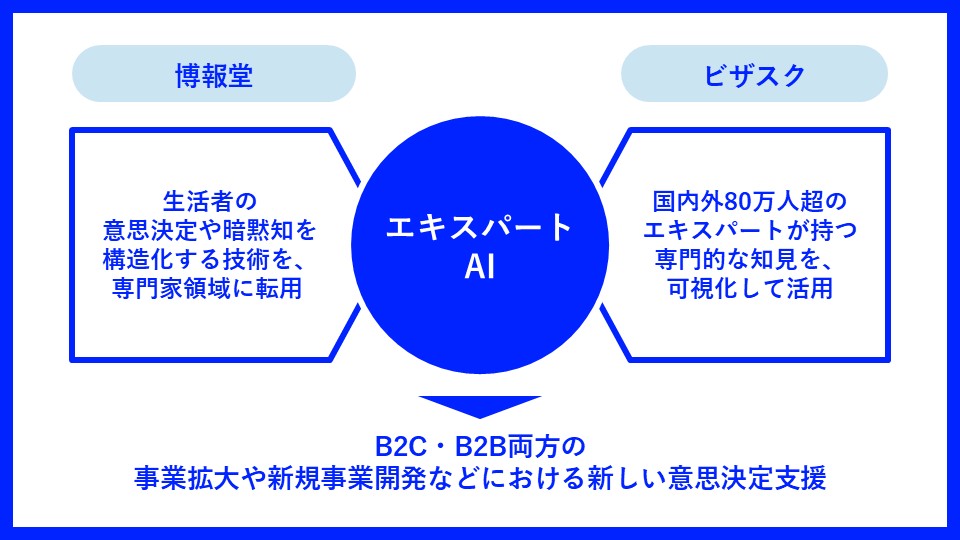 このたびの資本業務提携では、新規事業開発や市場参入・マーケティング戦略立案に取り組む企業の担当者に向けて、ビザスクのエキスパートが持つ業界特有の常識や視点と、博報堂が培ってきた意思決定の思考構造化のノウハウおよびAIエンジンを組み合わせたAIサービス「エキスパートAI」を共同開発します。